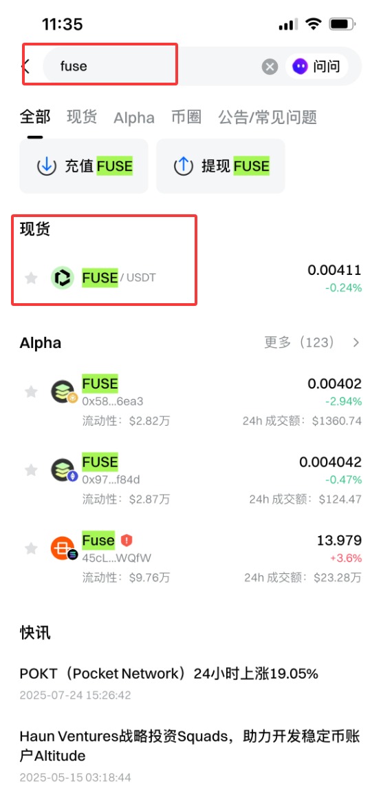 2.然后点击Gate.io APP内的搜索框,搜索FUSE币,选择FUSE/USDT