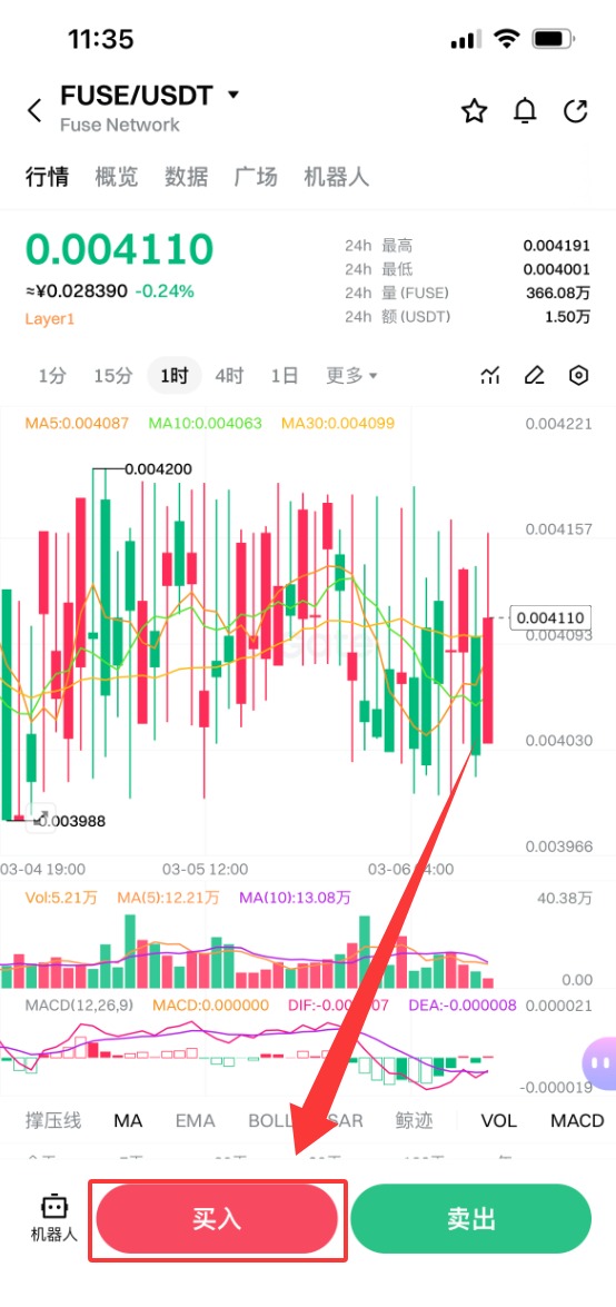 3.点击FUSE/USDT进入详情页面,就可以看到该币种的交易信息以及市场信息,点击下方的买入按钮