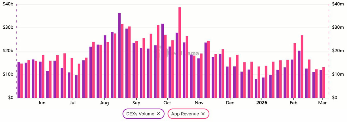 每周去中心化交易所交易量与以太坊DApp收入,单位:美元。来源:DefiLlama