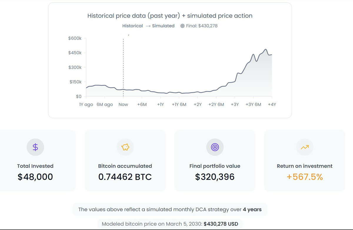 前瞻性模拟考察了 DCA 战略从 2026 年起可能的运作方式。从 2026 年 1 月开始,每周 250 美元的 DCA 到 2030 年 3 月可分配约 54,250 美元。