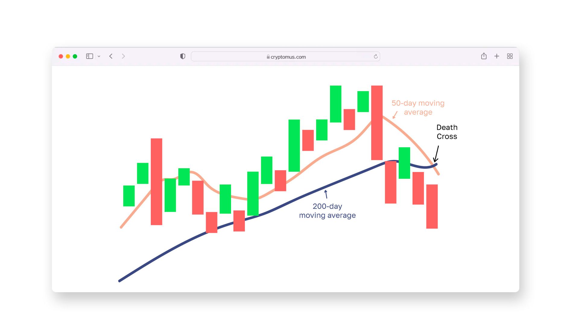 加密货币中的“死亡交叉”是一种看跌信号,当 50 日移动平均线跌破 200 日移动平均线时出现。这表明市场已经开始降温——价格正在下滑,投资者也变得更加谨慎。许多人认为这一信号预示着上涨趋势已经结束,一段长期下跌的时期即将开始。
