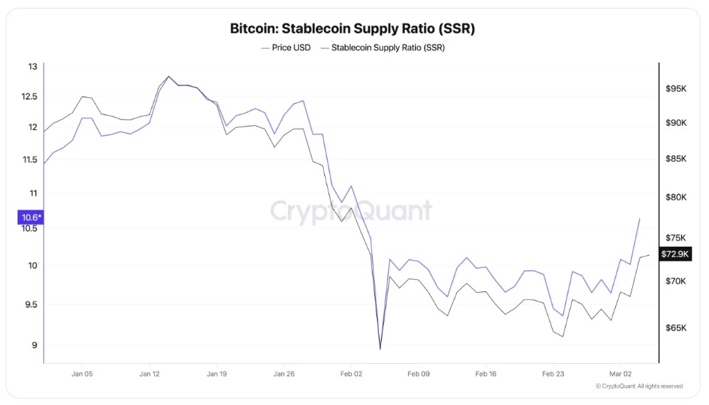 稳定币供应比率(SSR),或比特币的比率与稳定币市值相比,市场总市值在2月份暴跌后正‘稳步回升’,”CryptoQuant分析师Sunny Mom在周五的快速简报中表示,并补充道:
