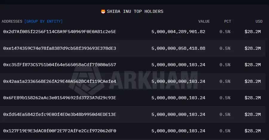 在链上有多个私人地址拥有0.5%左有的 SHIB