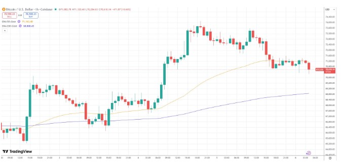 据TradingView数据显示,比特币在Coinbase上周四一度触及一月内高点74,000美元,并触碰了50日指数移动均线,但很快就下跌超过3,000美元,周五早盘时段已回落到71,000美元下方。