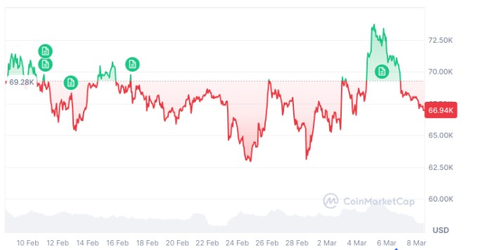 据CoinMarketCap报道,自去年十月创下历史新高126,000美元以来,比特币已累计下跌约46.82%,在发稿时的交易价格为67,012美元。