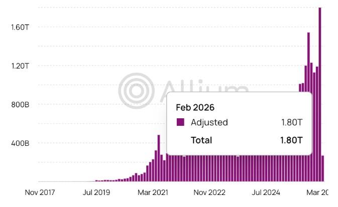 据Allium数据显示,2月份稳定币转账量达到1.8万亿美元,创下月度新高。