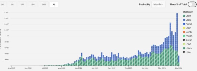 最新数据显示,稳定币月度交易量创下历史新高,Circle发行的USDC首次超越Tether的USDt。
