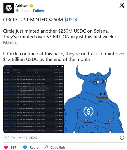 此外,USDC供应近几周增长速度快于USDt。Arkham 市场情报公司数据显示,3月份USDC已增发超过30亿美元,而USDt供应基本维持不变。