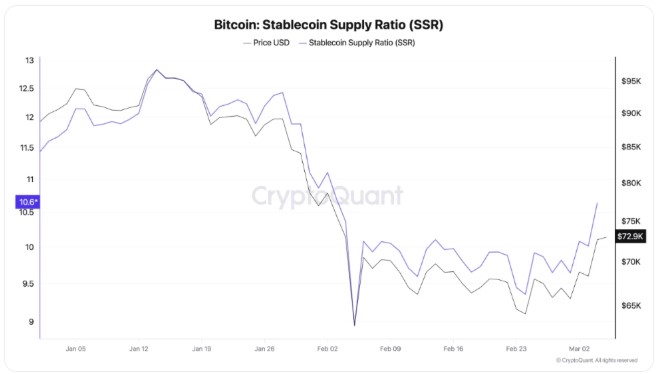 Stablecoin Supply Ratio(稳定币供应比,SSR),即比特币(BTC)市值相较于稳定币市值的比例,在2月份“暴跌后正稳步回暖”,CryptoQuant分析师Sunny Mom在周五的Quicktake贴文中指出,并补充:“这表明市场购买力正在回归。”