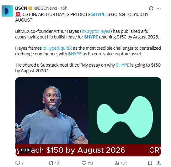 Arthur Hayes 的预测也增强了看涨情绪,他预测,如果生态系统继续发展,HYPE 代币到 2026 年 8 月可能会达到 150 美元。