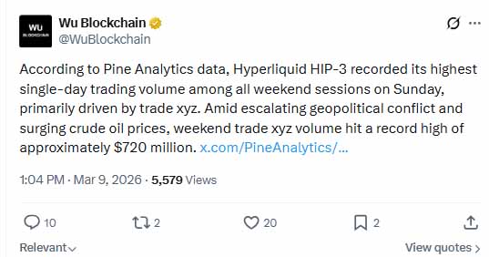 Pine Analytics 分享的、Wu Blockchain 重点报道的数据显示,HIP-3 市场创下了有史以来最高的周末交易量,单日交易量接近 7.2 亿美元。
