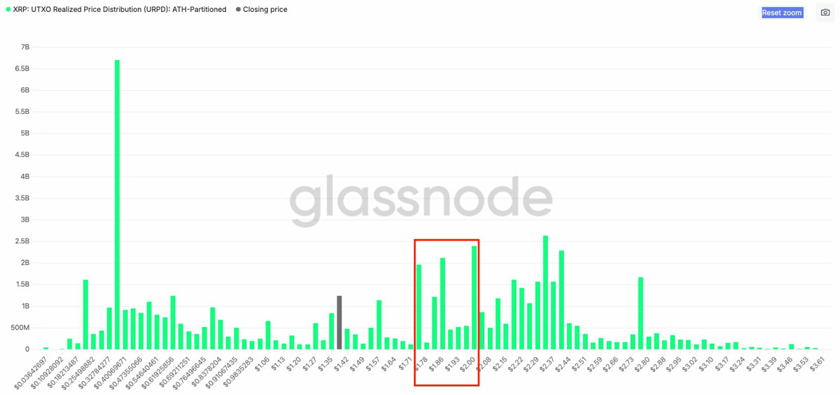 XRP 的 UTXO 实现价格分布(URPD)数据显示,存在大量供应集群保持在现货价格之上。2 美元区间占 XRP 供应量的 3.6%,1.80 美元占 3.15%,形成了强烈的上方阻力。