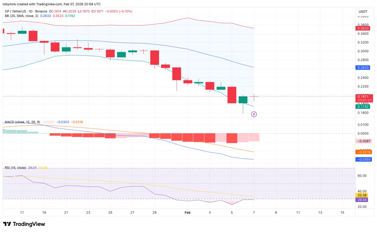 OP 开盘价约为 0.1974 美元,截至 2 月 7 日,目前交易价格接近 0.1971 美元,反映出在经历大幅抛售后,市场仍持观望态度。此前,OP 股价已较 1 月下旬接近 0.28 美元的高点下跌了约 30%。目前价格仍远低于日线布尔带中轨(约 0.263 美元),整体走势依然看跌。如果抛售压力再次出现,下轨(约 0.174 美元)将成为下一个下行阻力位。