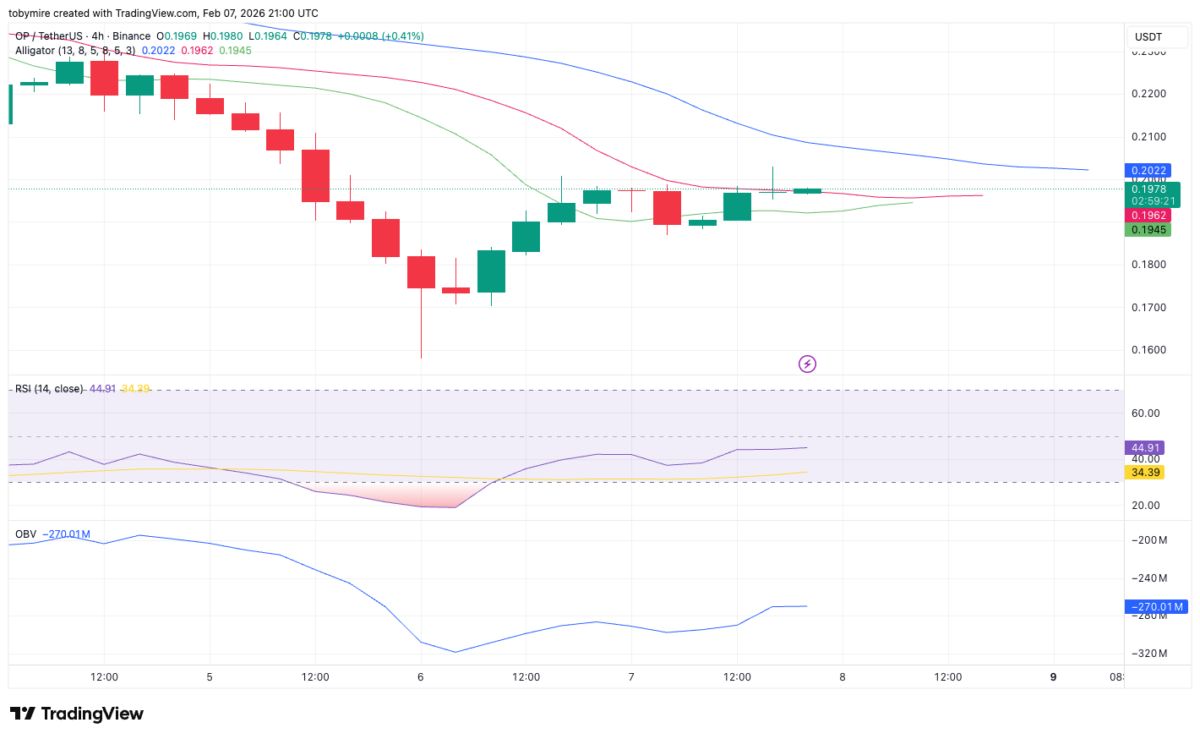 在4小时图上,OP开盘价接近0.1969美元,目前在0.1978美元附近交易,此前曾大幅下跌至0.16美元,随后从日内低点强劲反弹近20%。OP目前在0.195美元至0.198美元附近的鳄鱼形态内盘整,表明其处于平衡状态而非趋势扩张。