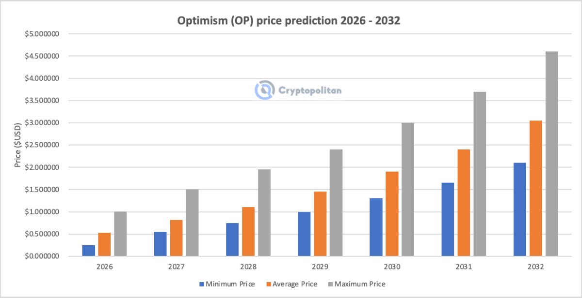 Cryptopolitan对 Optimism (OP) 的整体价格预测显示,该加密货币近期前景较为保守。2026 年的最高预测价格在 1 美元至 2 美元之间。未来几年,Optimism 预计将出现大幅上涨,价格有望从最低 12.65 美元上涨至 2032 年的最高 17.98 美元。