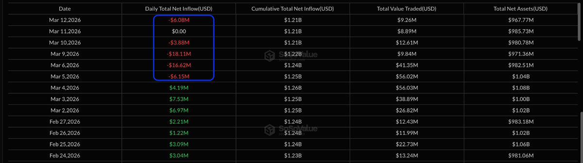 然而,由于现货 XRP 交易所交易基金 (ETF)持续赎回,XRP 的复苏可能会被延迟,这些 ETF 已连续五天记录了 5080 万美元的资金流出。
