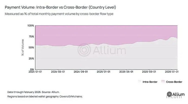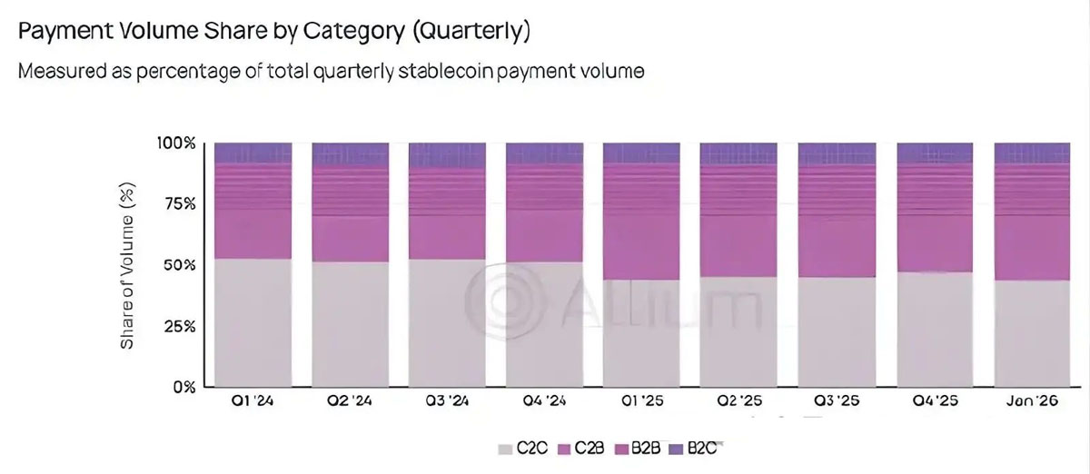 但单凭数字并不能说明多少增长问题。同样重要的是增长发生的背景,例如谁在使用稳定币,用于什么用途,以及使用模式是否正在发生变化。Allium 慷慨地提前向我们展示了他们关于稳定币基础设施的最新报告《稳定币:新型支付渠道的兴起》。这份报告值得一读,因为其中的图表显示,稳定币的使用正在从实现低成本跨境汇款转向支持一般商业活动和企业间的供应商支付。