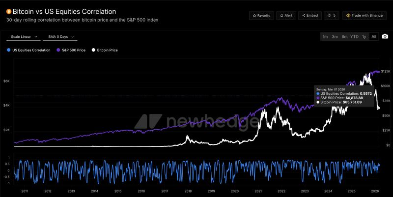 其一, “比特币与美股高度相关,因此无险可守”。这一判断在 2 月数据中得到验证,但需注意相关性本身是动态变化的。3 月 2 日地缘冲突爆发后,BTC 在 TradFi 休市期间表现出的韧性(自 63,000 美元快速反弹),与传统避险资产黄金的上涨形成共振,而与风险资产的预期下跌出现短暂背离。这种背离若在美股开盘后得到维持,可能成为相关性松动的最早信号。