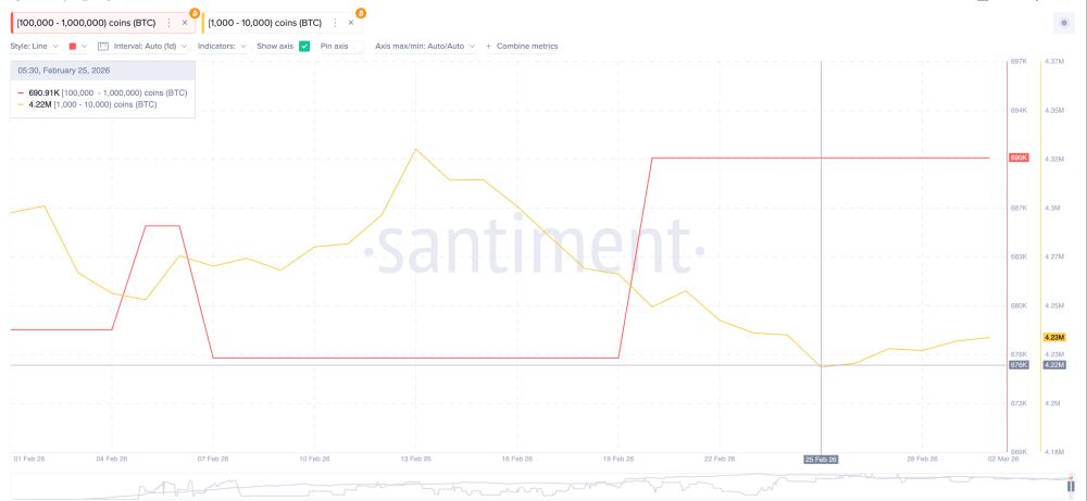 巨鲸积累行为:不同体量的巨鲸群体在过去一周表现出罕见的同步性。2 月 19 日至 20 日 BTC 短暂反弹期间,持有 10 万至 100 万枚 BTC 的超级巨鲸增持后未再派发;而持有 1,000 至 10,000 枚 BTC 的中型巨鲸则自 2 月 25 日起开始连续增持,持仓量从 422.2 万增至 423 万 BTC。这种在价格低迷期的积累行为,通常被视为对未来价值认可的信号。