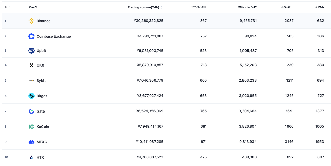 | 1 | Binance | ¥30,260,322,825 | 867 | 9,455,731 | 2087 | 632 | ARS, AUD, BRL and +86 more |