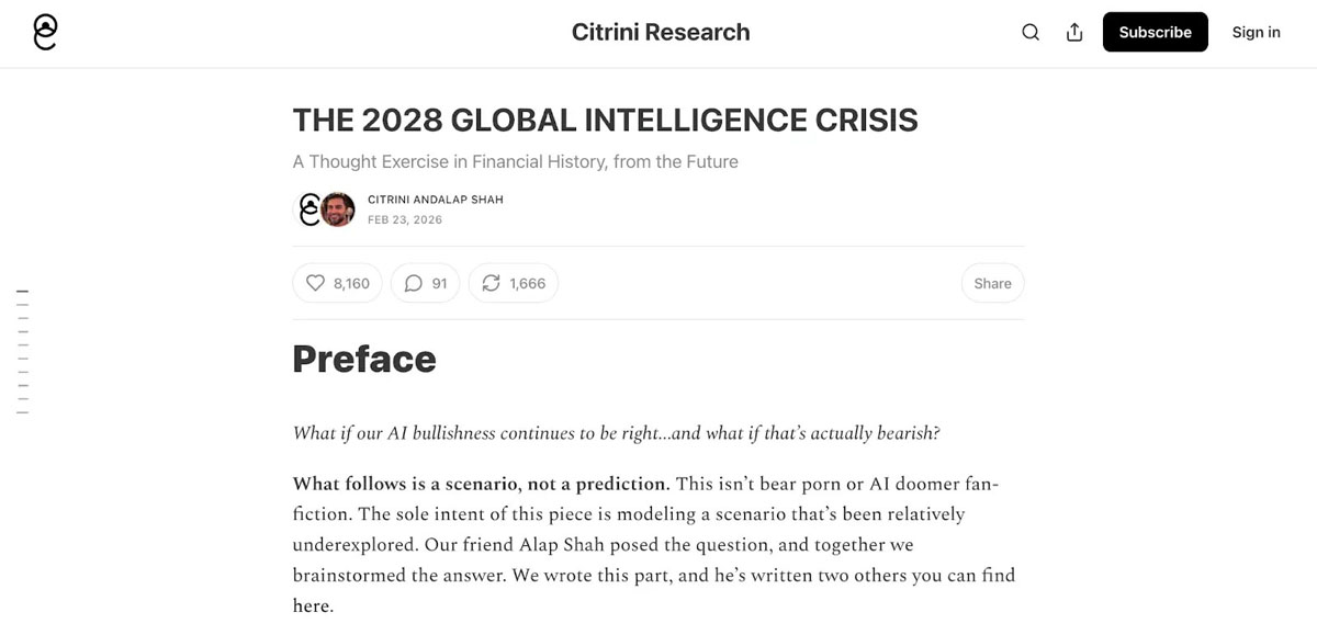 2026 年 2 月下旬,一家名为 Citrini Research 的独立机构在 Substack 上发布了一篇数千字的长篇情境报告,标题为《2028 年全球智能危机》(The 2028 Global Intelligence Crisis)。