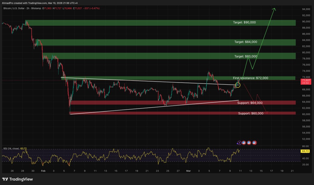 目前市场似乎处于整合阶段。如果比特币能够成功收复 72,000美元并将其转化为支撑位,资产通往六位数的道路可能会迅速开启。但如果跌破 65,000美元,市场可能会在真正的反弹开始前经历另一次快速洗筹。