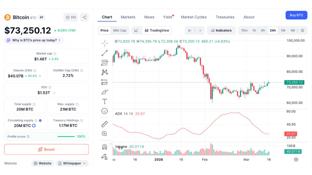 截至2026年3月16日的比特币24小时价格走势图(来源:CoinMarketCap)