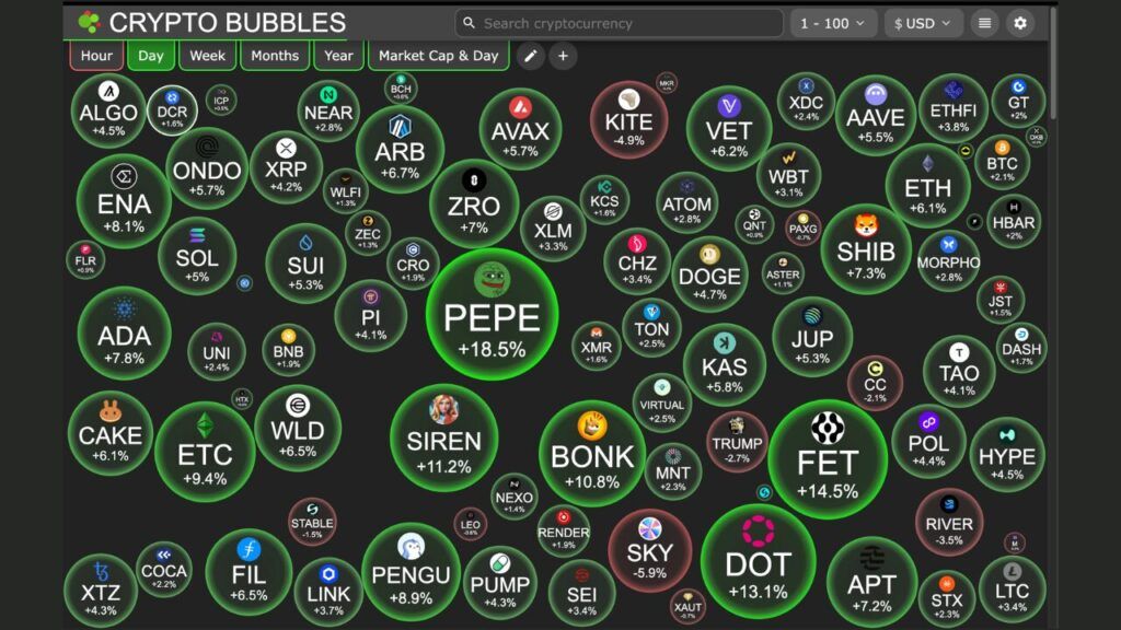 截至2026年3月16日,过去24小时内代币价格走势。(来源:Crypto Bubbles)