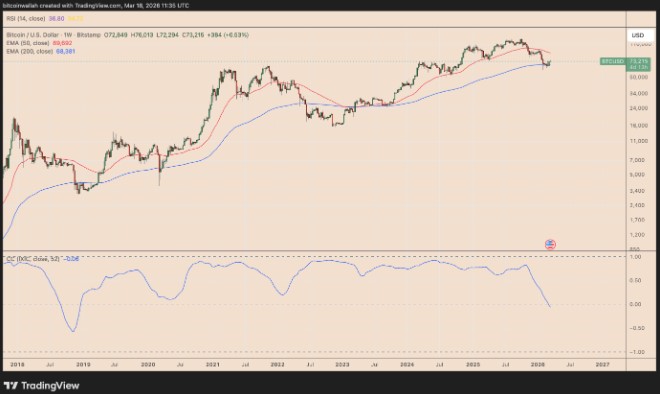 BTC/USD周线图与IXIC相关系数。来源:TradingView