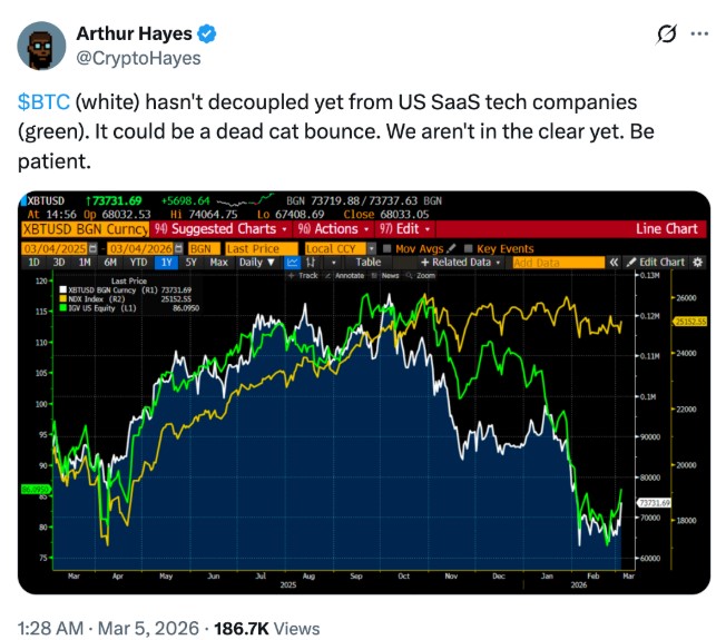 BitMEX联合创始人Arthur Hayes在3月5日的帖子中指出,比特币近期向中部区间7万美元的上涨,可能是“死猫反弹”,同时警告称,在金融环境进一步收紧下,SaaS类股票持续疲软,或将继续拖累比特币。