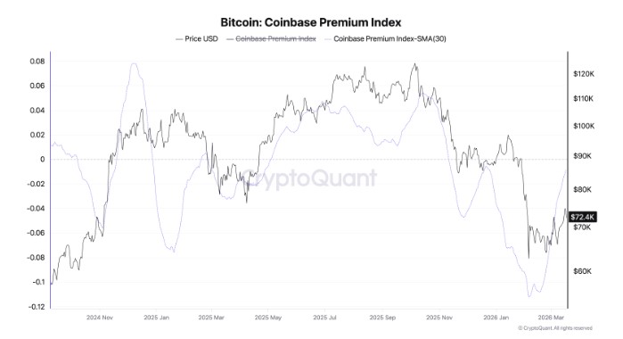 比特币Coinbase溢价指数与价格走势。来源:CryptoQuant