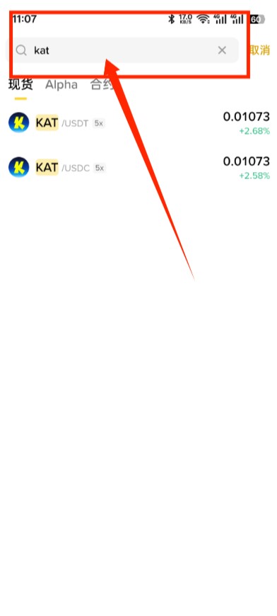 2.上方搜索栏,搜索相关币种:KAT,选择相应的币种