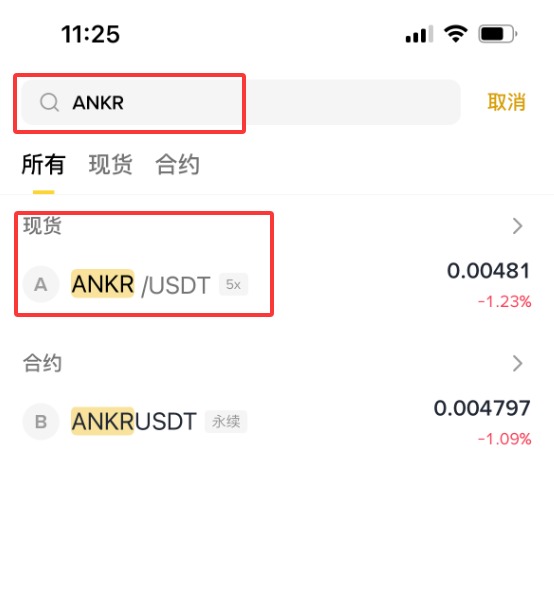3、输入【ANKR】,这时下拉会显示【现货】【ANKR/ USDT】,点击【ANKR/ USDT】。(作为新手,不建议做合约,所以这里就不演示合约购买方式了。)