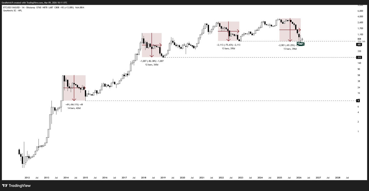 Geometric 的分析师表示 ,过去三轮 BTC/GOLD 熊市持续了 12-14 个月,回撤幅度在 75% 到 84% 之间。