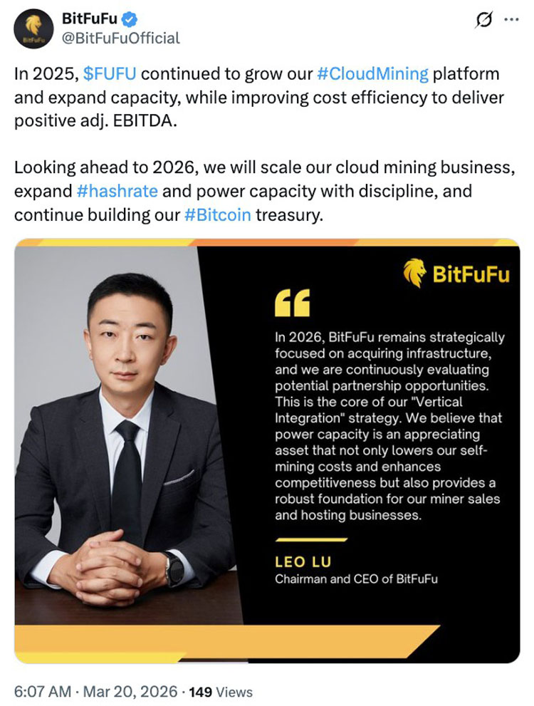 “展望2026年,我们将有条不紊地扩大云挖矿业务规模,提升算力和电力容量,并持续充实我们的比特币储备。”公司在X平台的一份声明中表示。