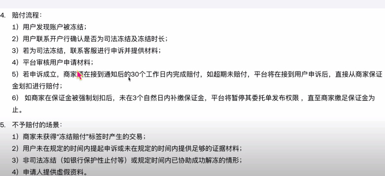 赔付的流程就是,如果你发现账户被冻结了,你要确认这个冻结是司法冻结,以及它的冻结时长。你去准备一下相关的材料,然后找平台进行申诉。平台审核通过之后,就会让商家来对你进行赔付。如果商家不给的话,因为商家在平台上是有质押保证金的,通常是50000U,所以他赔付的上限是50000U,就把这个保证金赔给你。不予赔付的场景就是说,如果你提供虚假材料,不是司法冻结。或者说这个事已经了了就不赔付,这都是可以理解的。