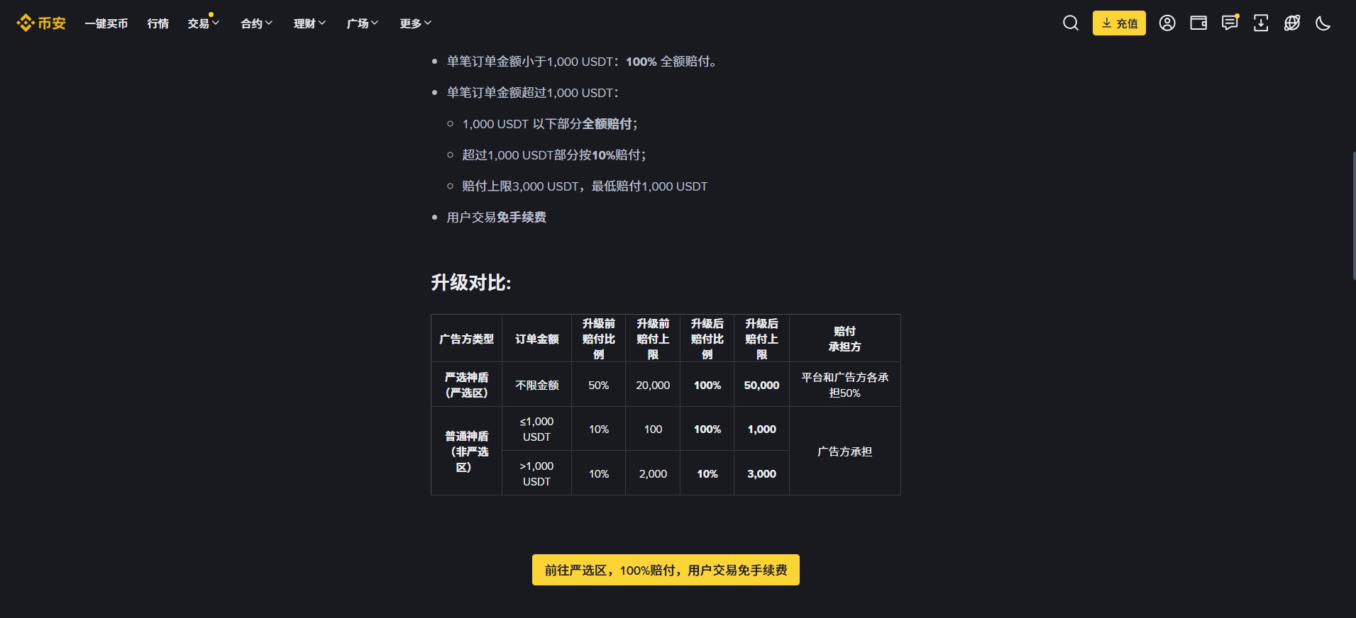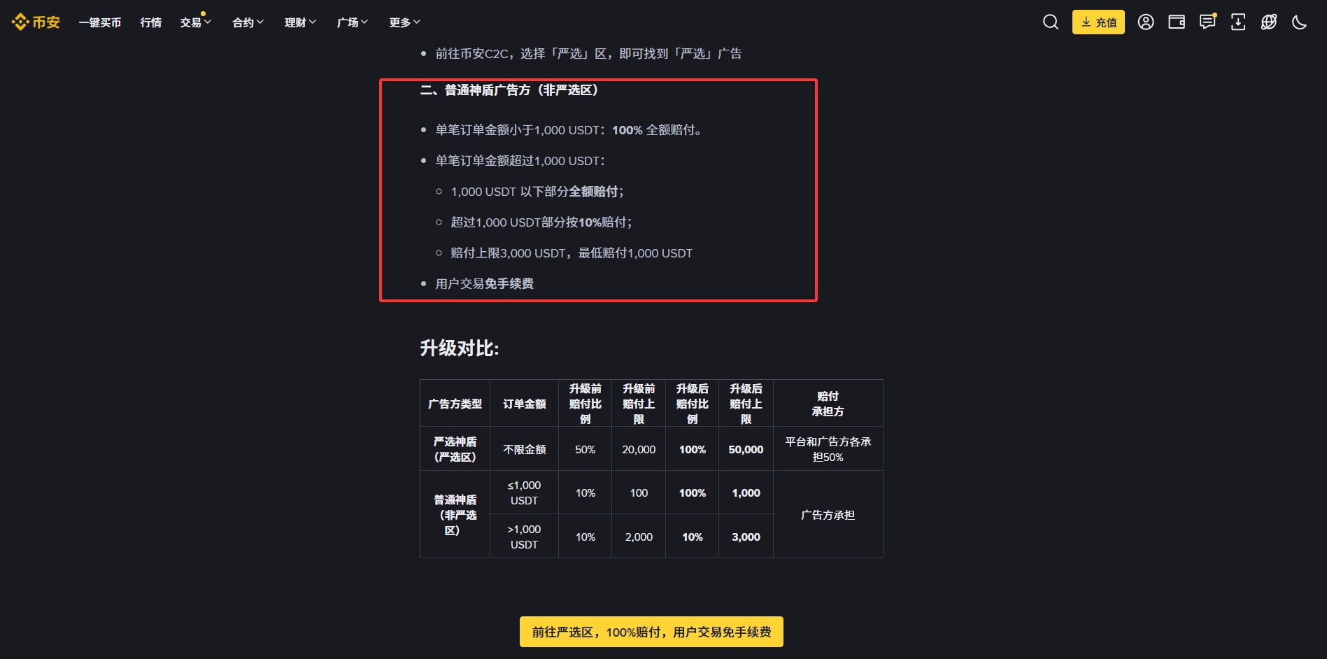 有的人可能会问,在这个范围内出金安不安全呢?其实我觉得也是可以放心的,因为只要有这样的一条制度在,他就是能够约束商家的。我想在币安上的商家,如果想赚钱的话,他是想来持续经营的,他也不会说为了你这么一点钱,就把自己变成了一个黑商家,更何况它还有赔付的要求。而币安它也是没有任何交易手续费的,这个是非常良心的。所以不管它的赔付比例以及他的费用,币安在行业里这方面肯定做的是最好的。