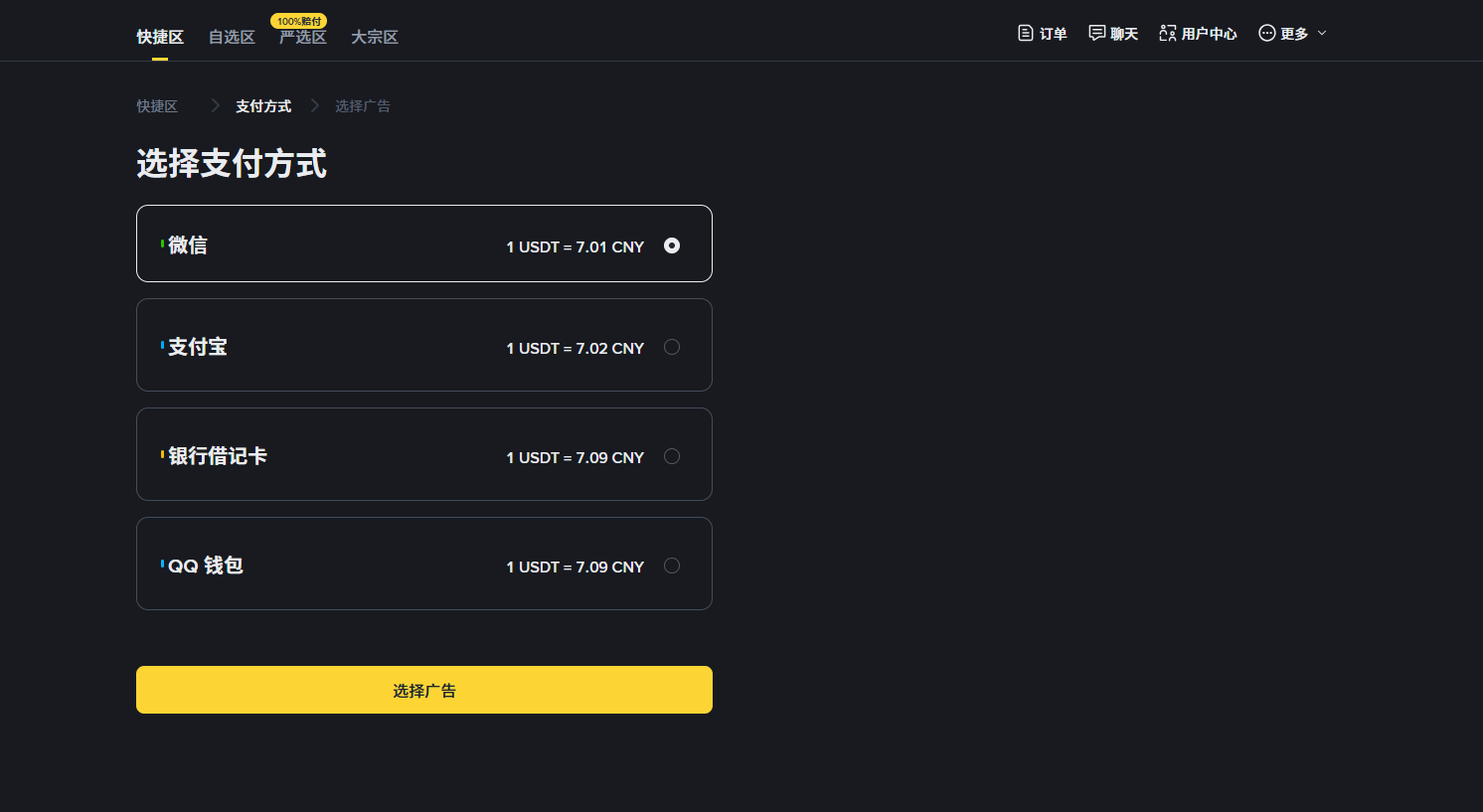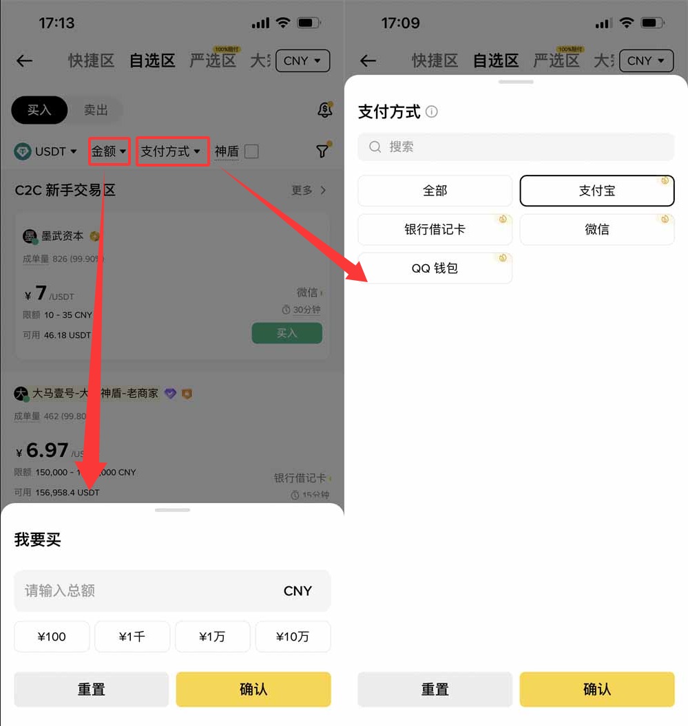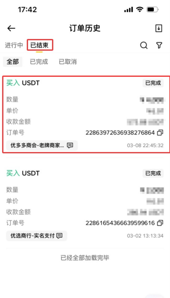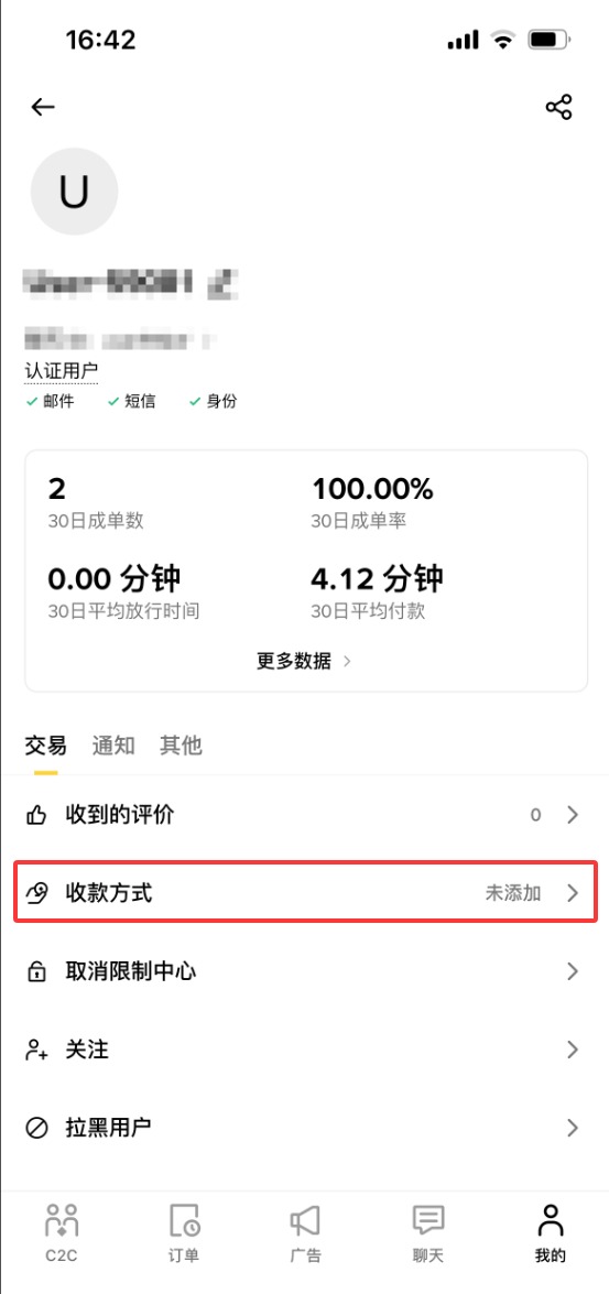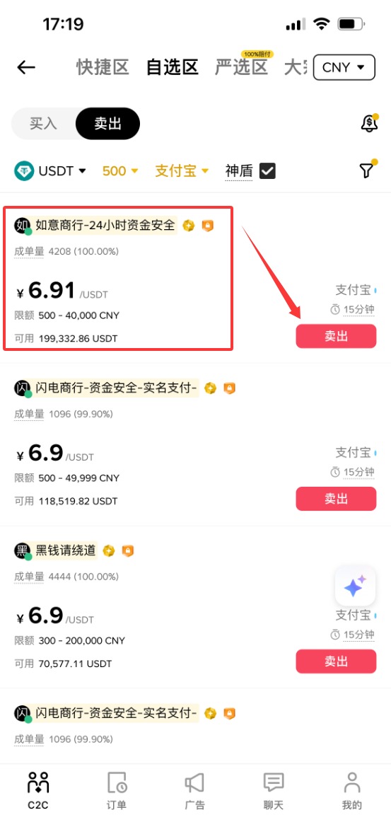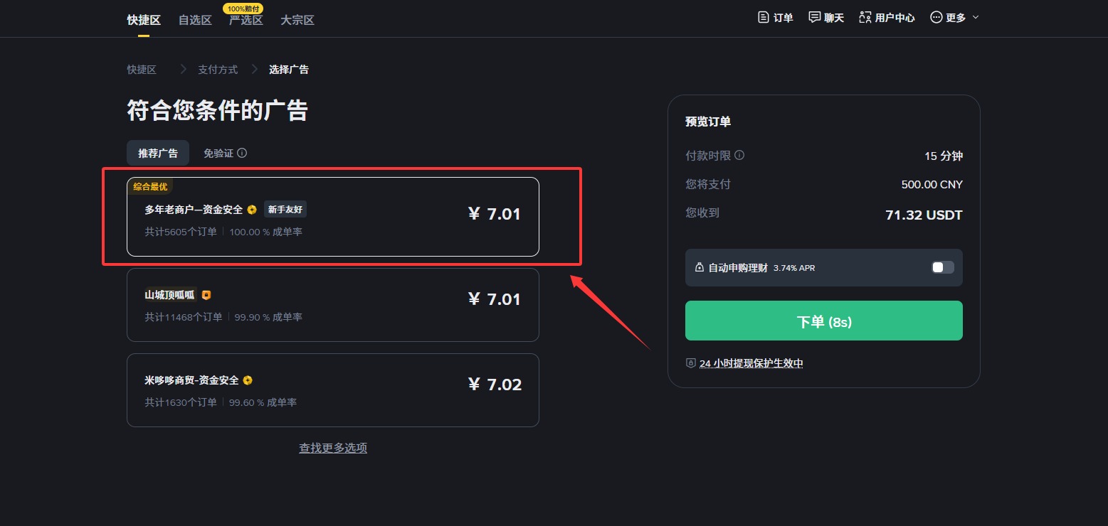 现在我的收款方式就已经添加好了,接下来我们就可以筛选商家来进行出售的交易了。