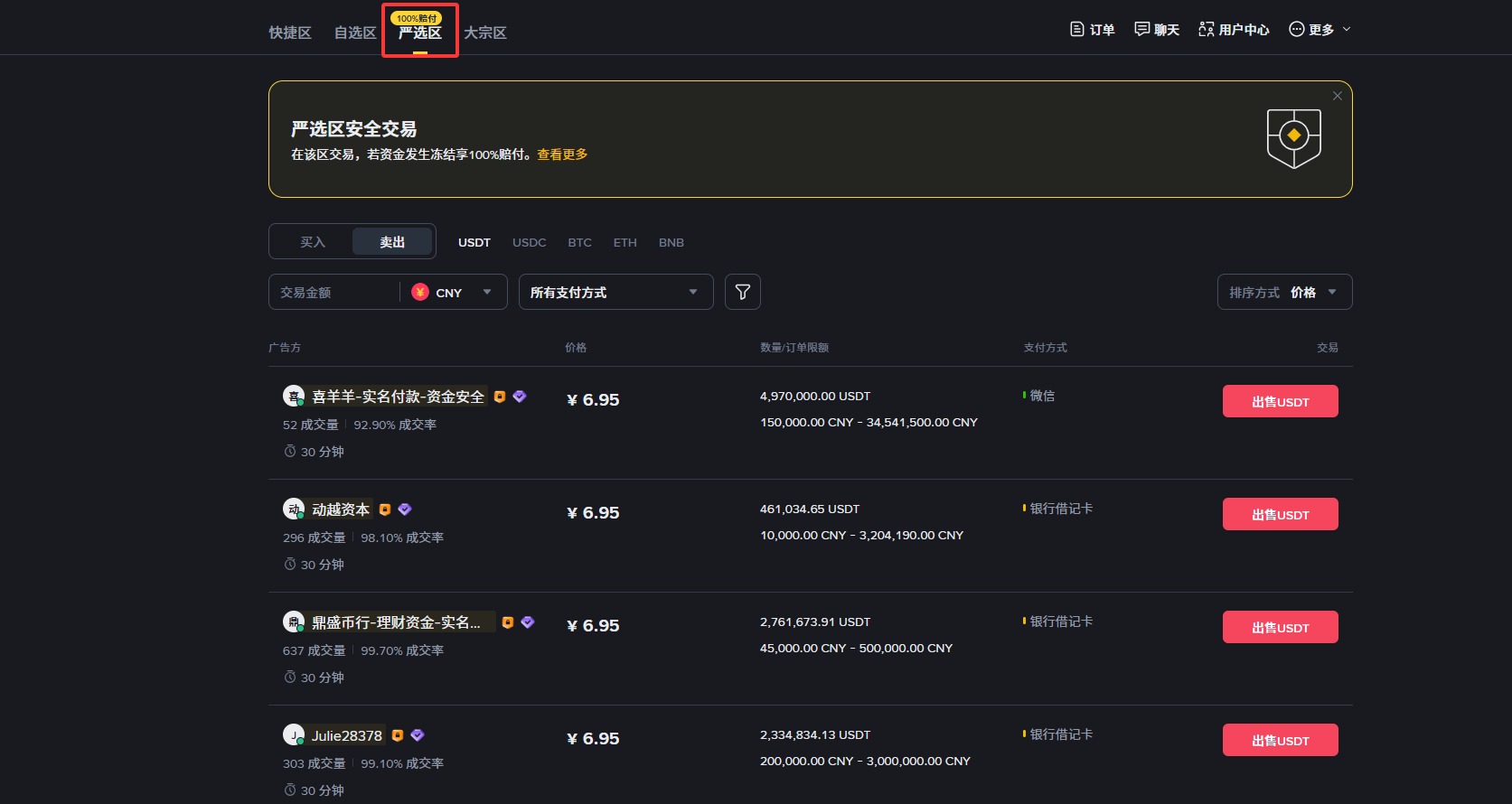 以上就是使用币安交易所出售加密货币的完整过程,是不是还挺简单的,而且看起来还是挺安心的。接下来我们再来看一下,怎么出售严选区交易。