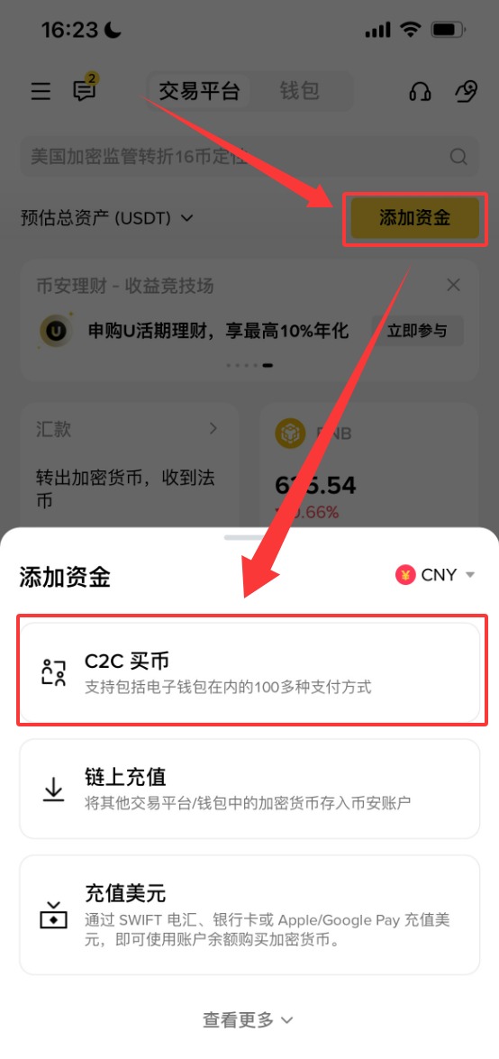 进入到币安APP之后,点击上方的【添加资金】,选择【C2C买币】。