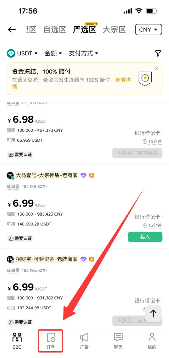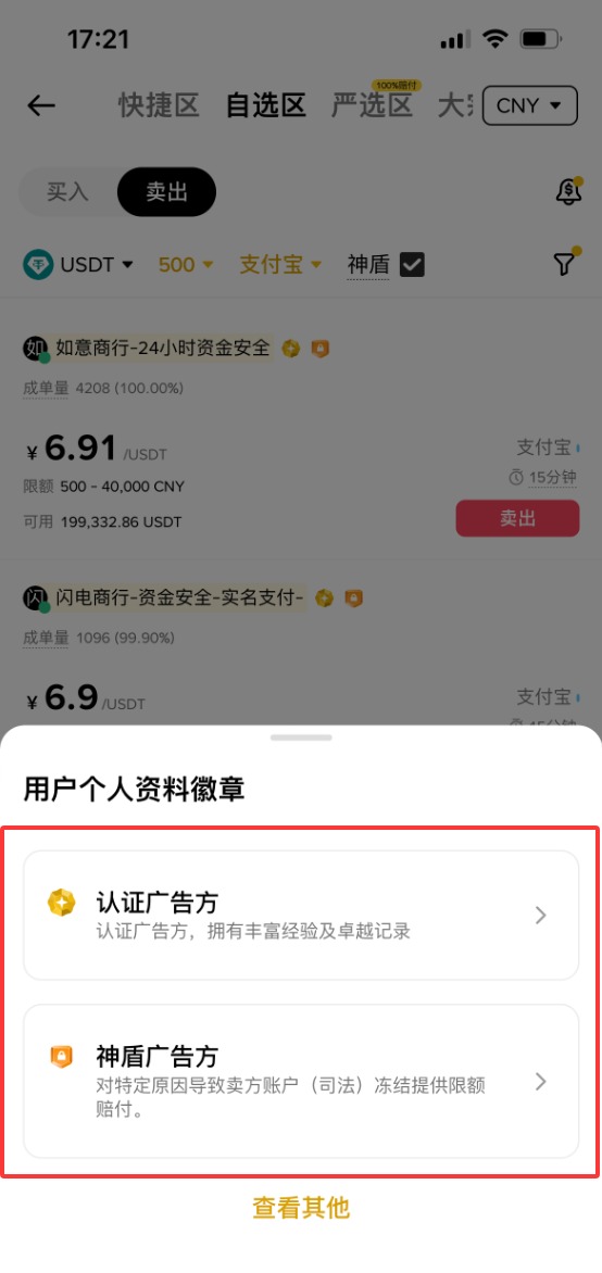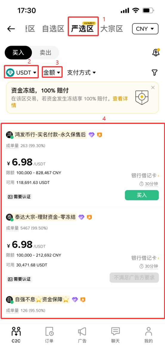 我们在上方选择“严选区”,币种还是选择“USDT”,你可以筛选一下金额。大宗交易的这些商家的资质都是钻石商家,就比普通认证的商家要求要更高,资质要更好。但是我们要涉及到严选区交易,毕竟钱更多,我们可以更加的谨慎一些,对商家可以进一步的筛选。