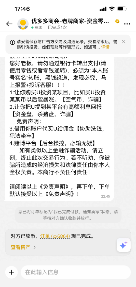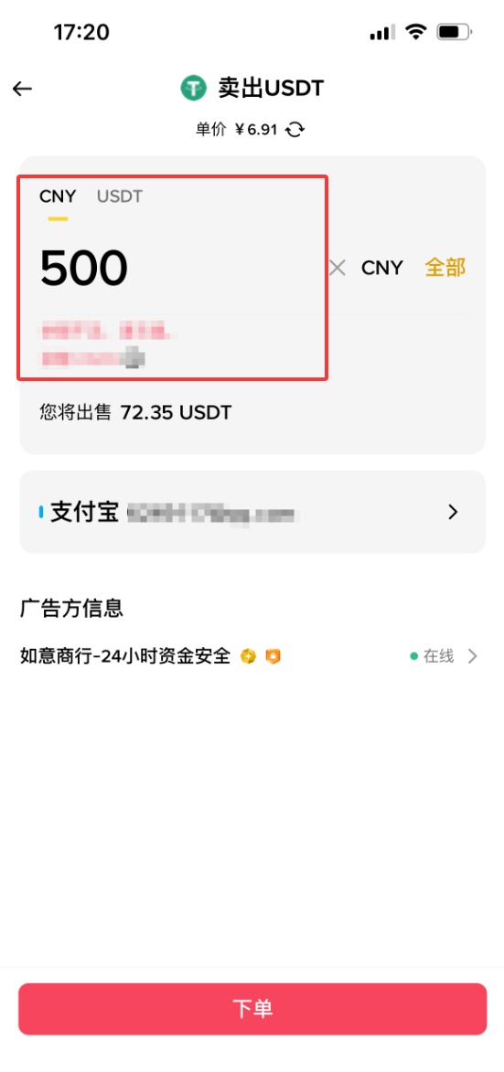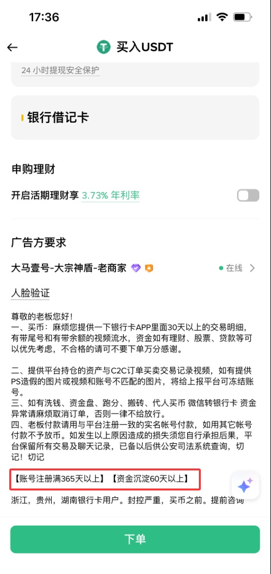 然后输入一下你要出售的数量或者是金额,之后你点击下方的【下单】。然后这个商家会根据我们的收款方式给我们打钱,这时候大家要注意,非商家本人KYC给你转账的,一概要拒绝和他们交易。比如说他说他自己的账户限额,他用他老婆、亲戚、或者是爸妈的账户给你转钱的一概要拒绝。当我们收到买家已经完成付款的提醒之后,不要去盲目相信短信的提醒,去确认一下自己真的收到钱了,再点击确认收款的按钮,这样我们才可以把USDT放行给买家。