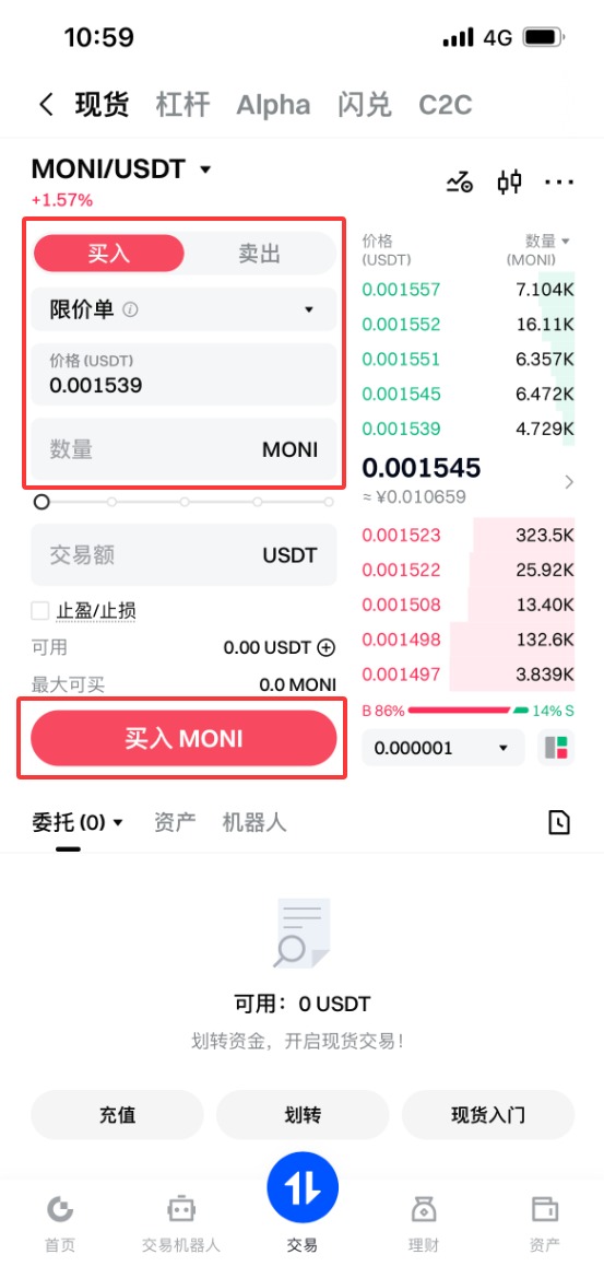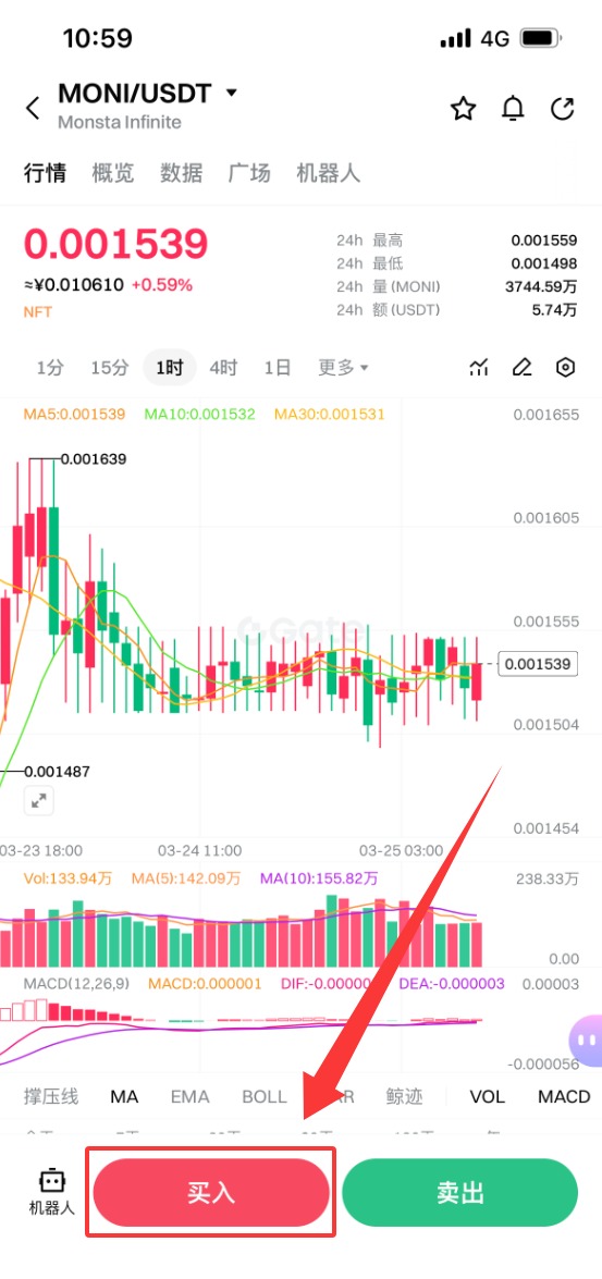 3.点击MONI/USDT进入详情页面,就可以看到该币种的交易信息以及市场信息,点击下方的买入按钮