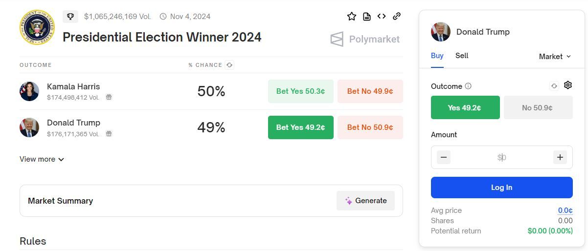 Polymarket 以事件发生的概率当作购买股份时的价格,对于用户而言更加直观,可以从概率推断出目前市场参与者的走向,且这种代替传统赔率的计算方式也让用户无法直接将Polymarket与赌博网站联想在一起。