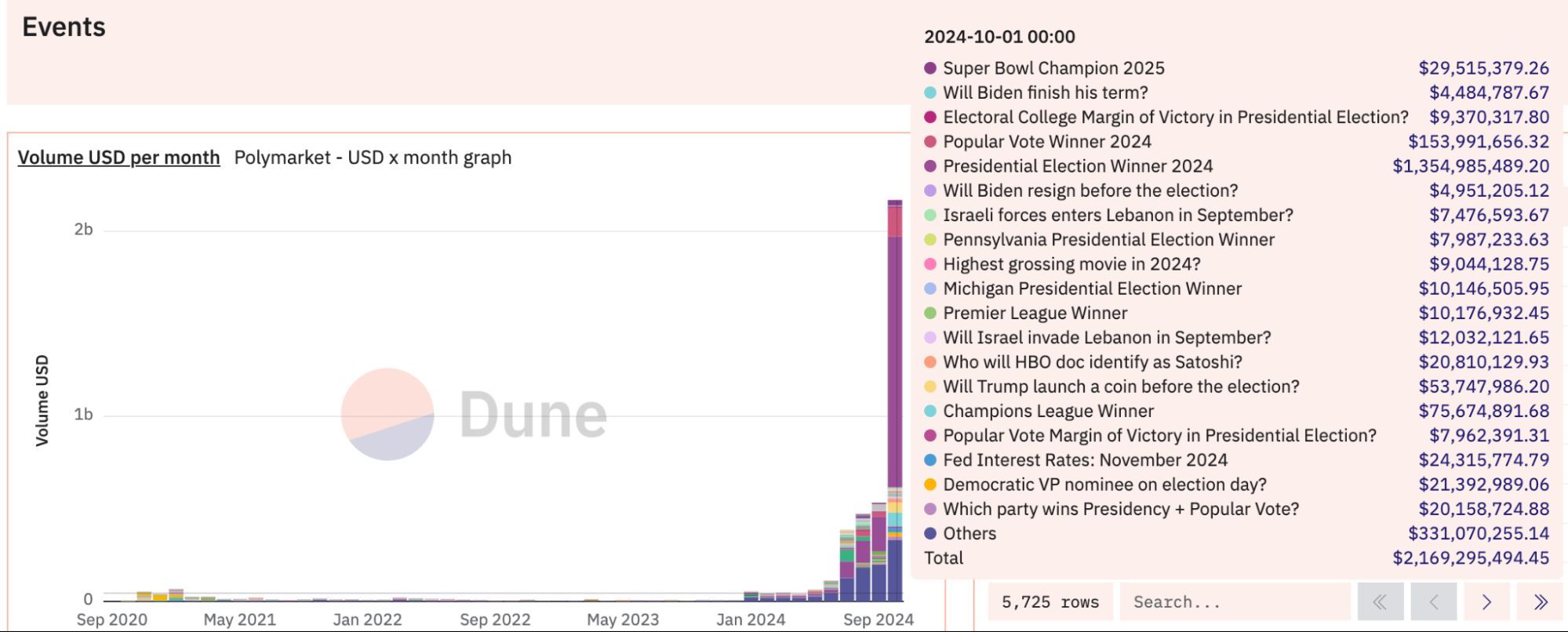 根据 DefiLlama 的统计,Polymarket 在 2024 年的 TVL 从 9.6M 成长至 339.5M,增长幅度高达 35 倍,十月单月更是吸引了超过 200M 的资金挹注,活跃地址数超过 30,000 个。其中最受欢迎的预测市场为「Presidential Election Winner 2024」,也就是美国总统大选的预测结果,交易量随着选举日期愈来愈近而节节攀升,目前月交易量已突破13 亿美金,占Polymarket 总交易量的62%。