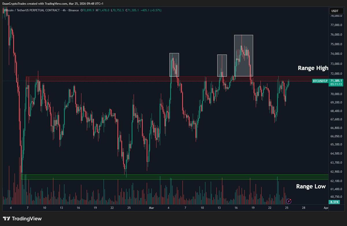 BTC/USDT 永续合约四小时图。来源:Daan Crypto Trades/X