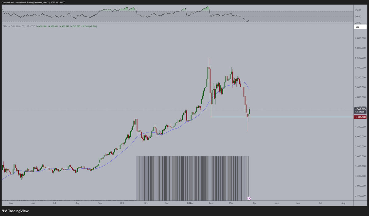 XAU/USD 一日图含 RSI 数据。来源:Michaël Van de Poppe/X