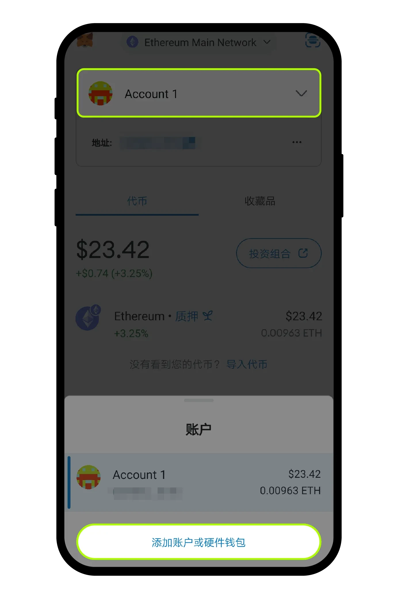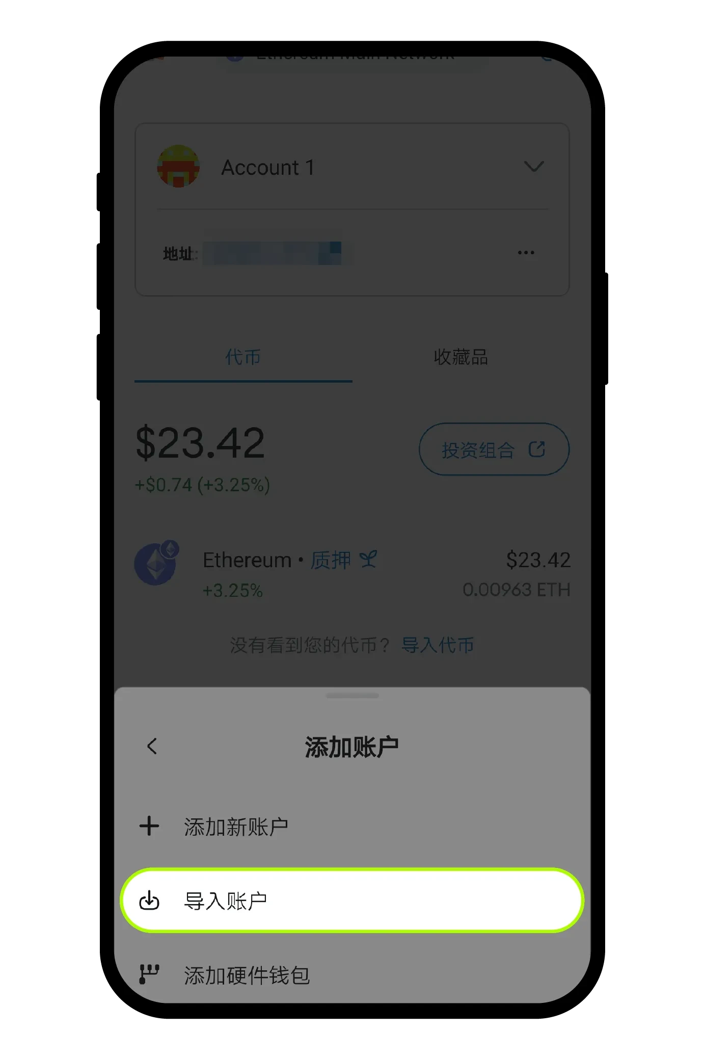 点击钱包图标选择【导入账户】
