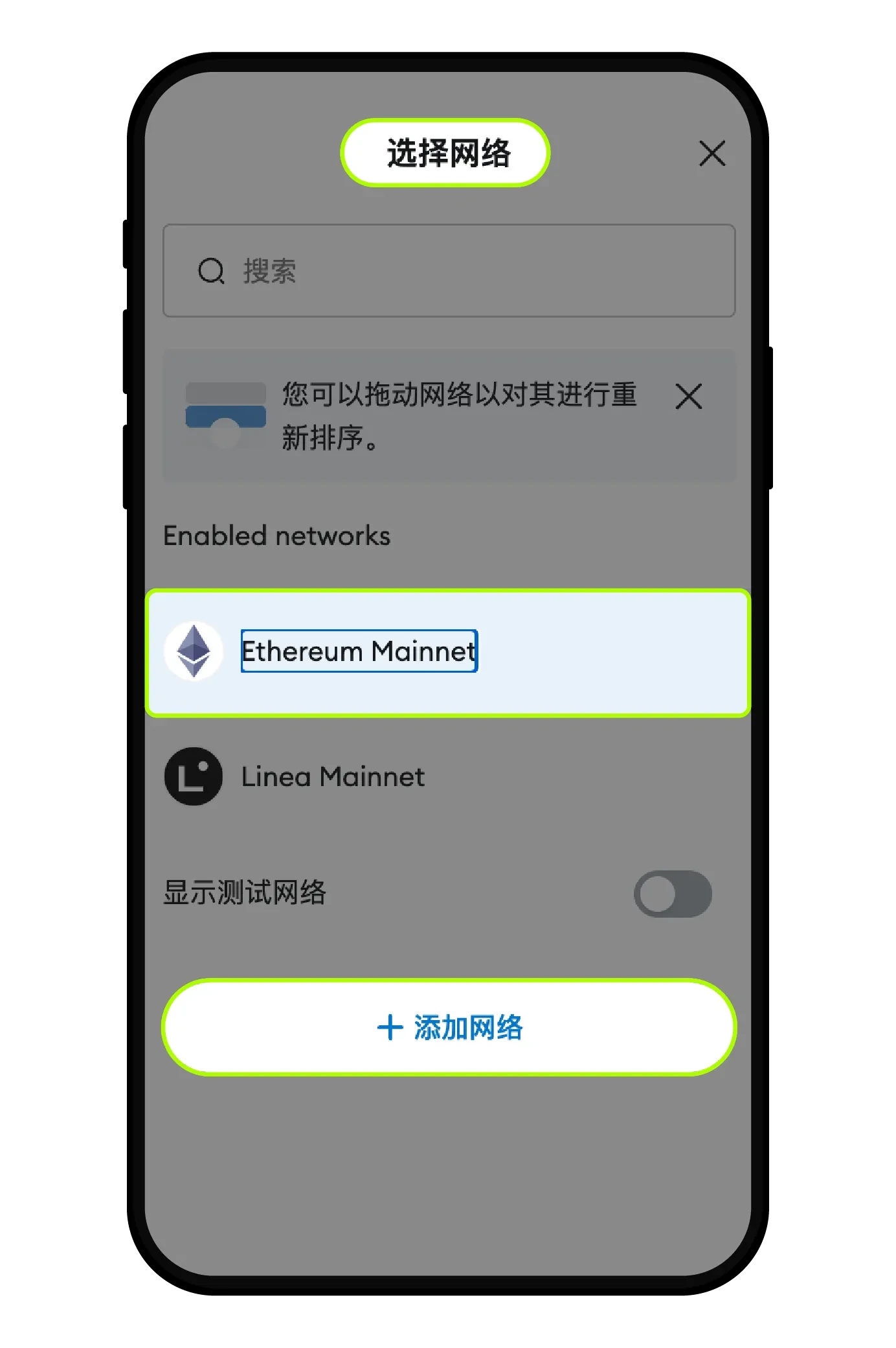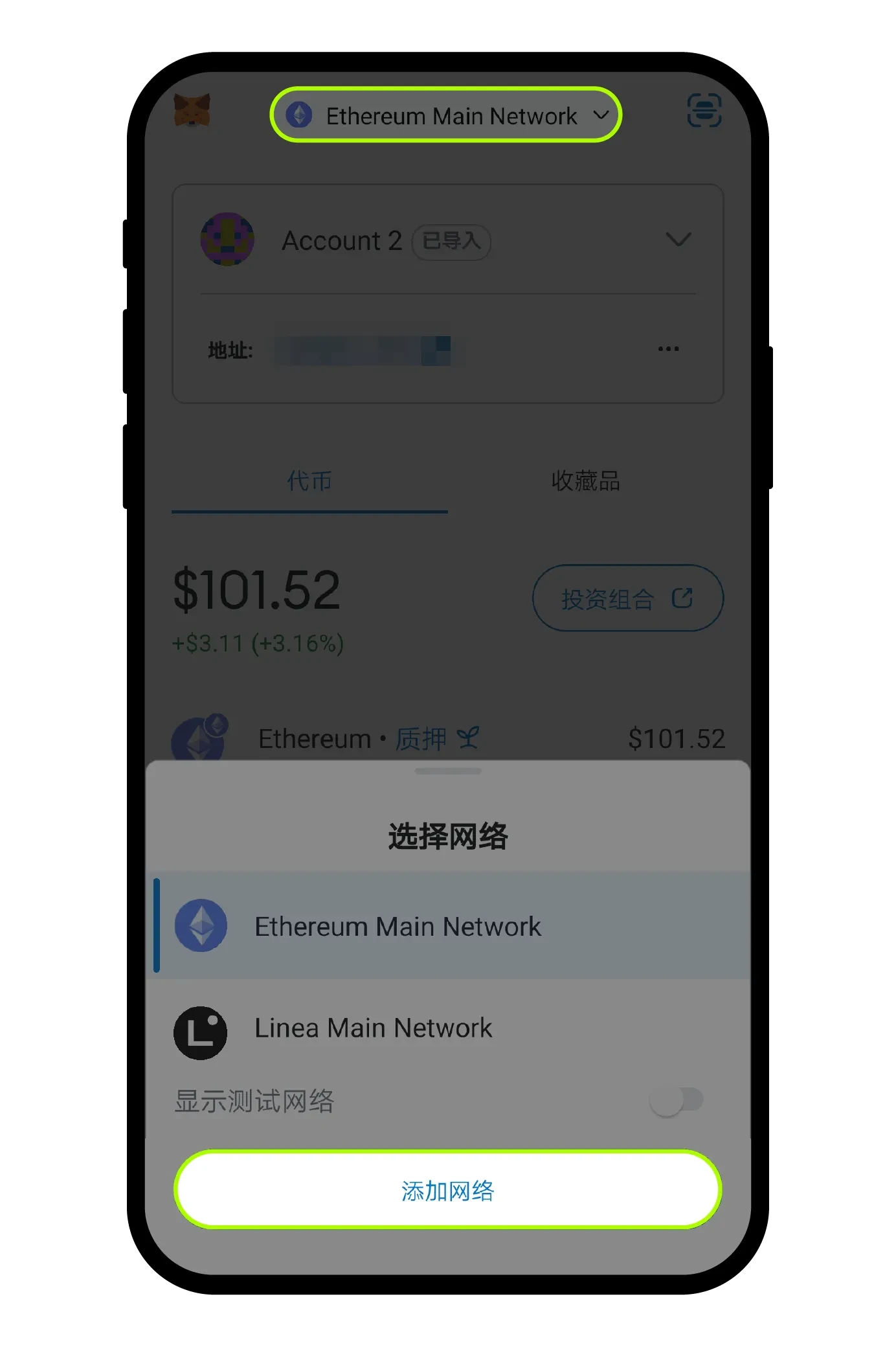 点击MetaMask钱包App ,选择您转进币种所选择的网络,您也可以点击【Add a network】查看更多的网络;