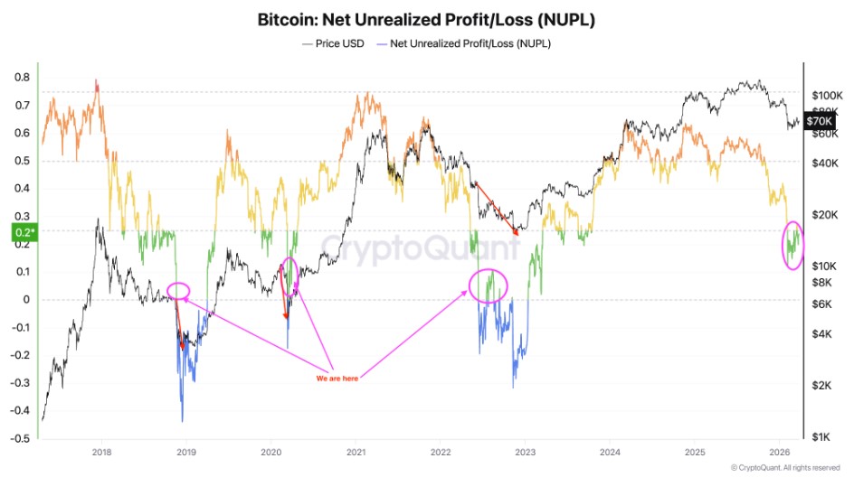 “NUPL指标回暖至0.25以上将标志转入乐观区域,这一转变历来与价格动能增强相契合。”